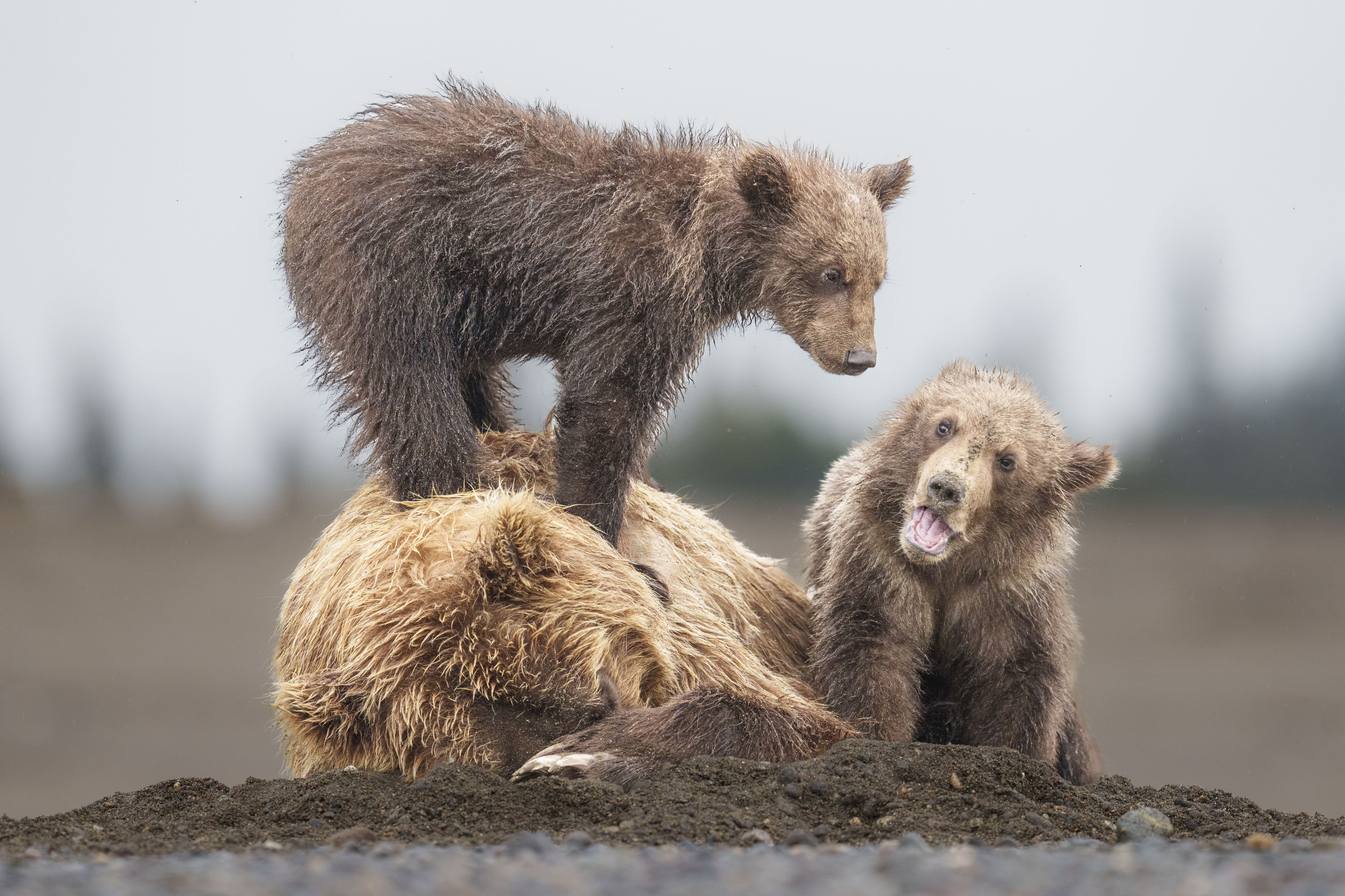 A young brown bear cub clambers up his mother’s back, using her as a climbing post while she rests. While this playful behavior strengthens coordination, it also reveals the patience required of a mother, bear or human, as their offspring learn through exploration
