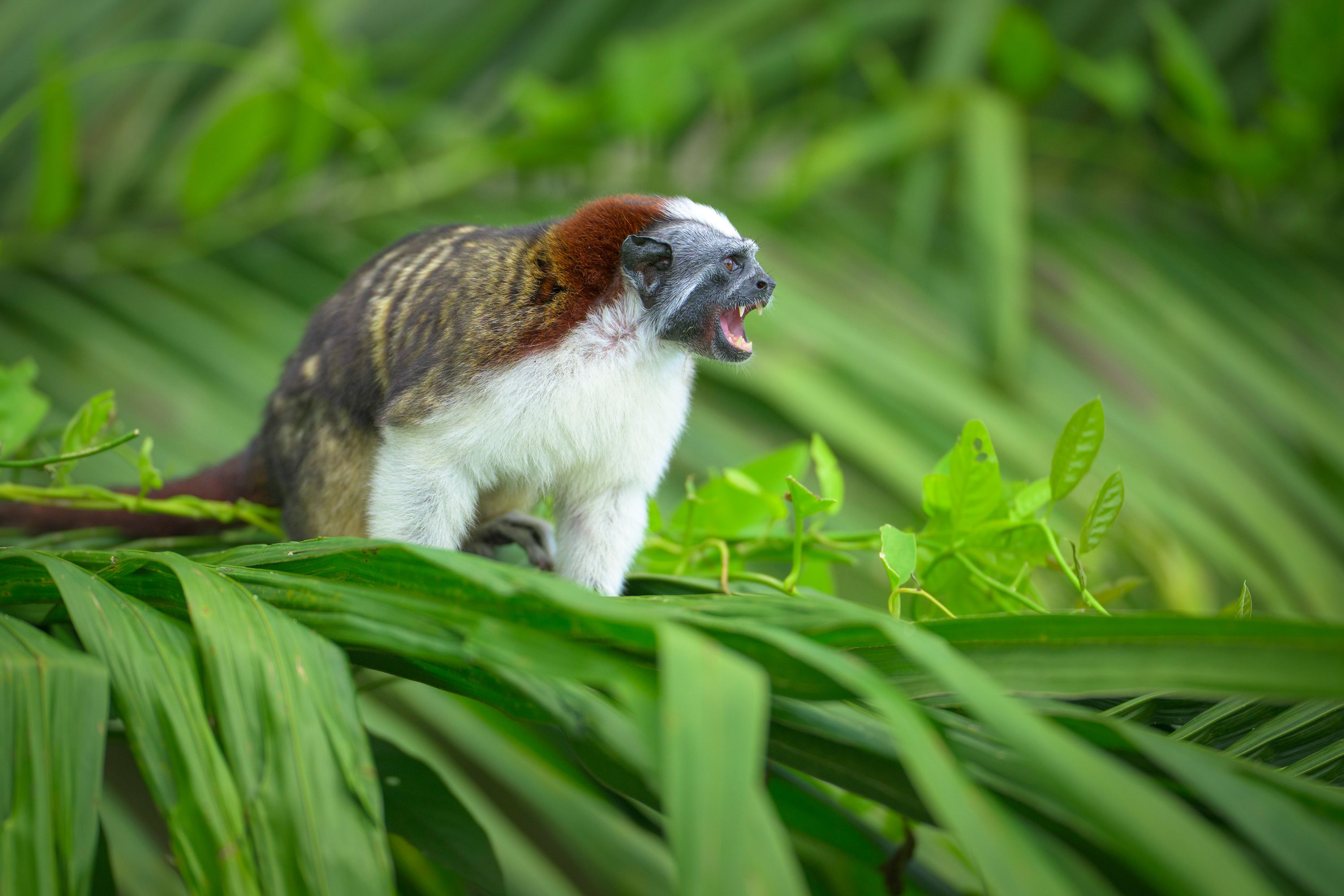 animal behavior, animal call, animal wildlife, animals in the wild, arboreal animal, biodiversity, dense forest, environment, environmental conservation, environmental problems, green background, lush foliage, monkey, natural condition, nature, primate, rainforest, tamarin monkey, territorial animal, threatened species, tropical climate, tropical rainforest, tropical tree, warning behavior, wildlife observation, no people, outdoors, animal, forest, mammal, cute, one animal, close-up, small, geoffroy's tamari, wildlife conservation, black market, illegal pet trade, Panama Canal, Soberanía National Park, deforestation