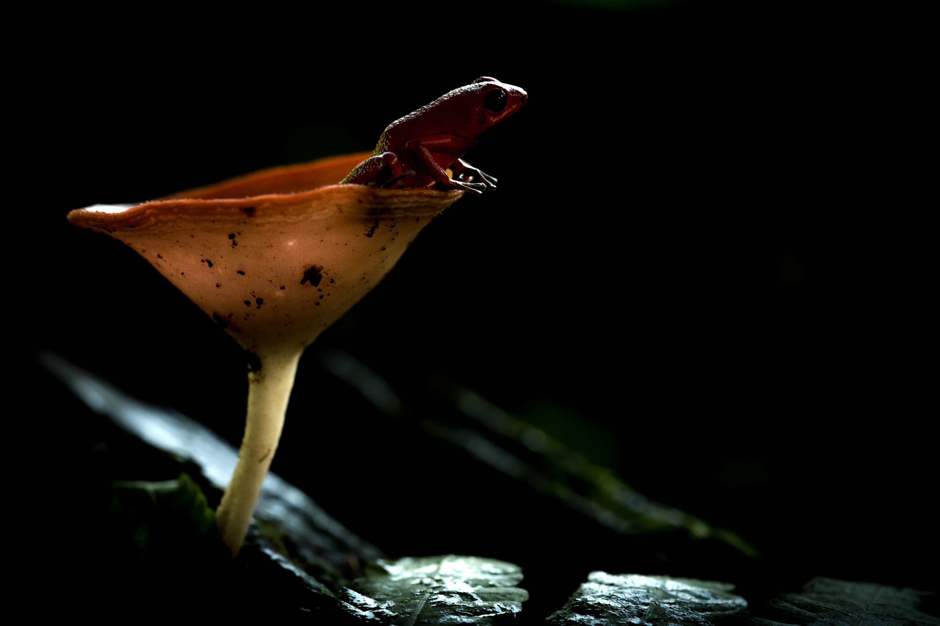 amphibian, animal wildlife, animals in the wild, biodiversity, bioreserve,dense forest, ecosystem, endemic - species, environment, forest floor, frog, natural condition, rainforest, small, threatened species, tropical rainforest, wilderness, wildlife observation, fungus, herpetology, mushroom, poison arrow frog, poisonous, symbiotic relationship, no people, nature, outdoors, close-up, macrophotography, tropical climate, strawberry poison dart frog, Bocas del Toro, Island Bastimentos National Marine Park,